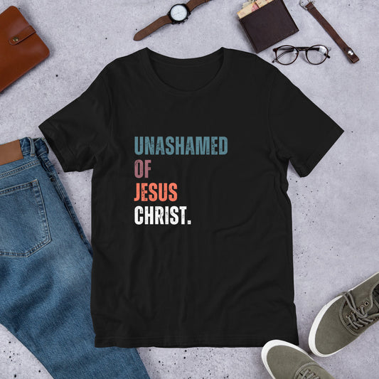 Unashamed of Jesus Christ. Colored Text. Unisex t-shirt